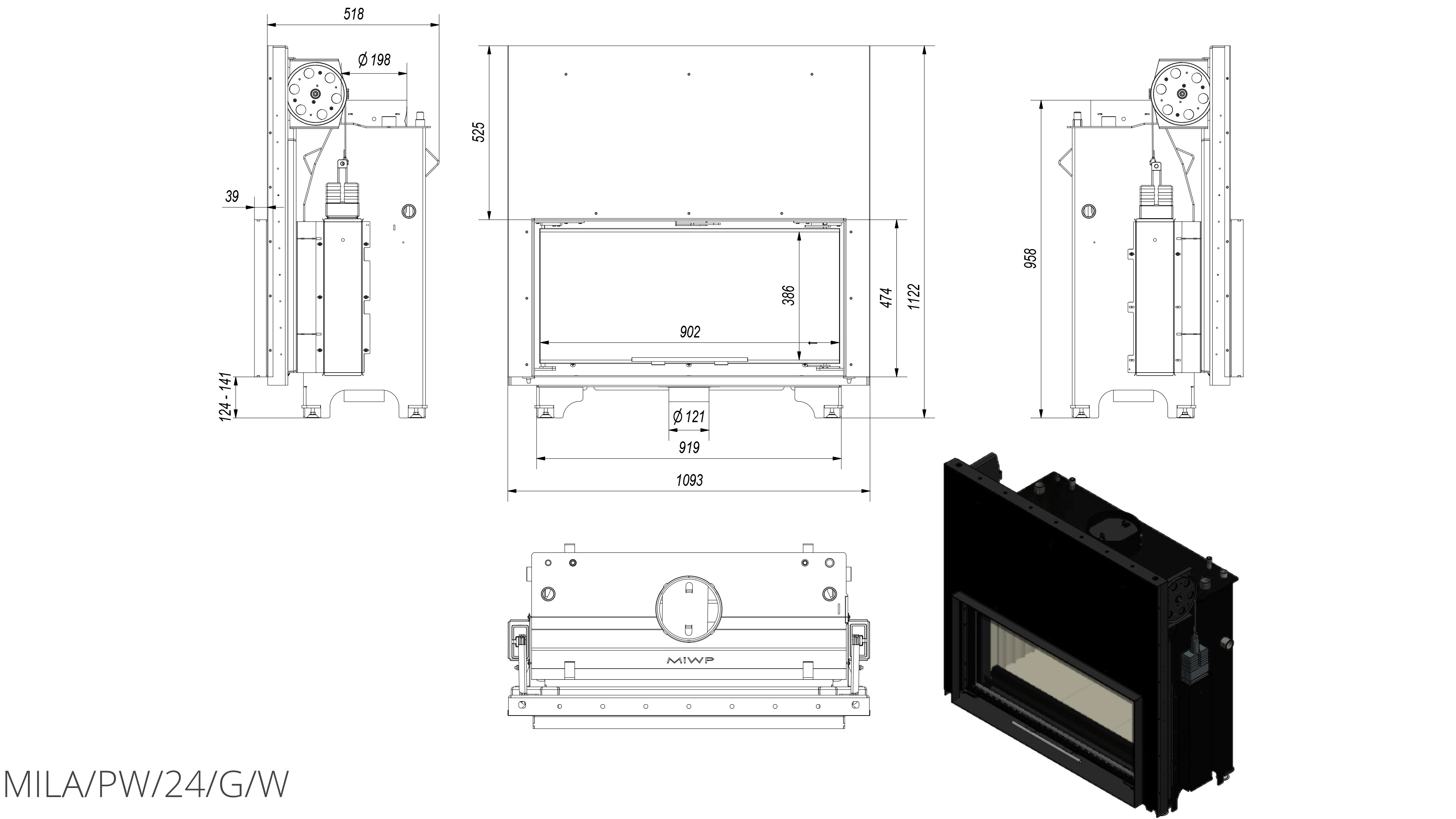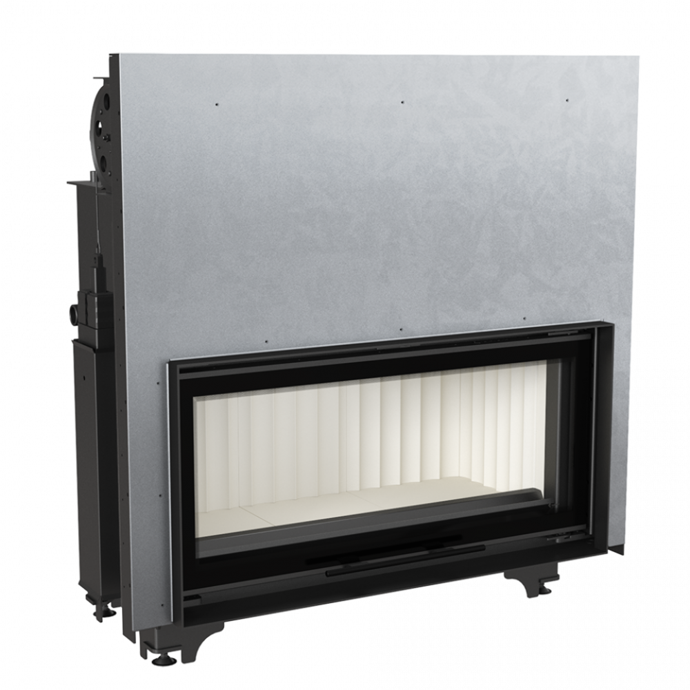 Каминная топка с водяным контуром Kratki Mila/PW/24/G/W (гильотина) с панорамной передней стороной и большим созерцанием огня. Дверца каминной топки имеет гильотинный принцип открывания - вверх. Топливом может служить древесина лиственных пород или брикеты угля. Стенки топочной камеры обложены негорючим вермикулитом.