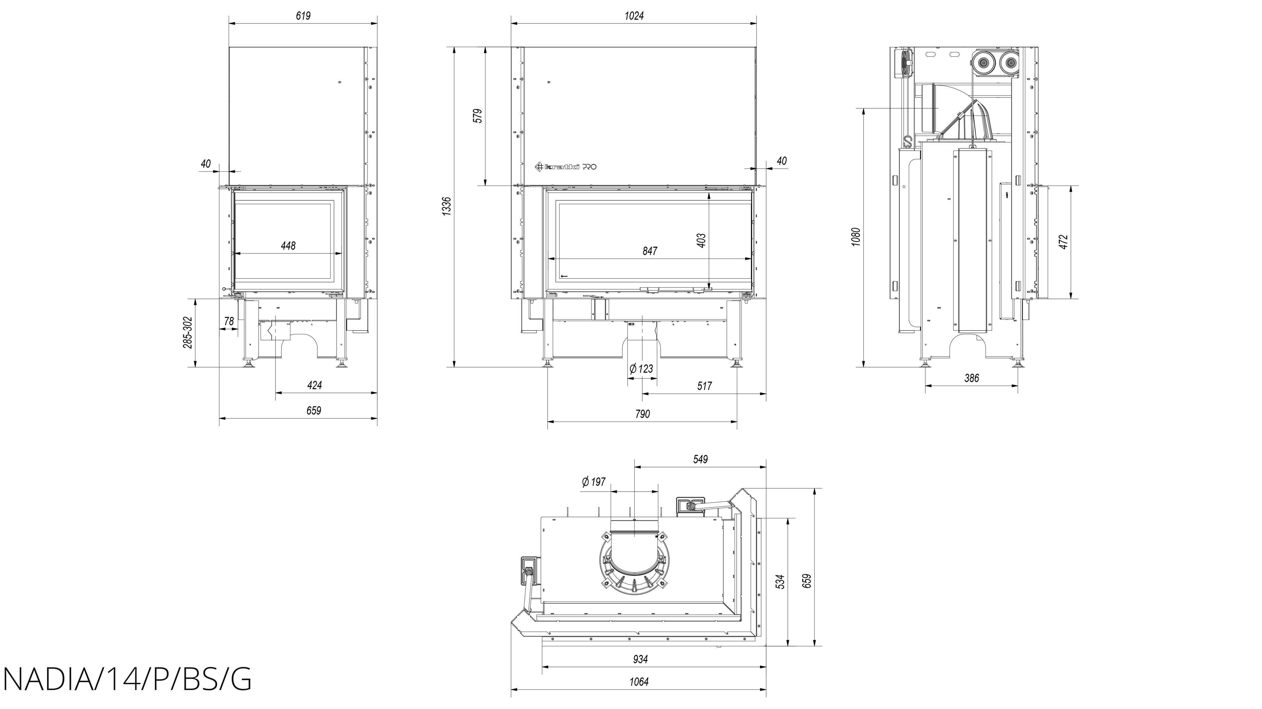 Предназначается для установки в угол помещения, для этого она оснащена большим Г-образным окном из жаропрочной стеклокерамики. Особенность данной модели является вертикальный подъем дверцы для закладки дров, что соответствует современным тенденциям в мире каминостроения.