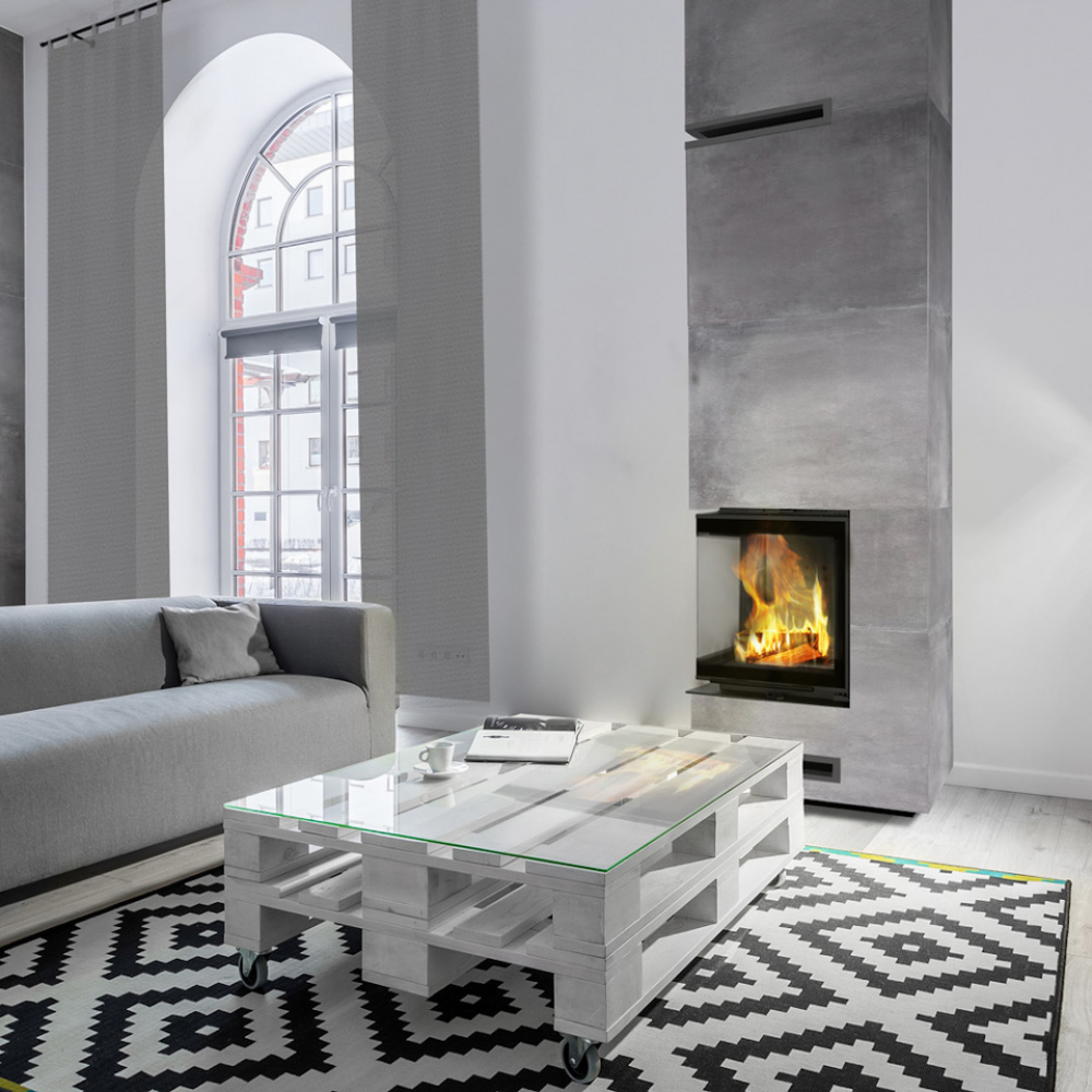 - Благодаря дверцам, что поднимаются и опускаются вертикально, очень удобно помещать древесину в камеру сгорания. Дополнительный механизм, который позволяет боковое открывание стеклянных панелей, что облегчает очистку и поддержание чистоты камеры сгорания.