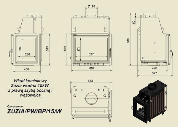 Каминная топка Kratki Zuzia/PW/BP/15/W (стекло справа, змеевик) — это топка небольшой мощности со встроенным теплообменником, дополнительным остекленеем с правой стороны и змеевиком. Данную топку можно размещать в каминах углового типа – остекление с двух сторон позволяет прекрасно видеть огонь с нескольких сторон.