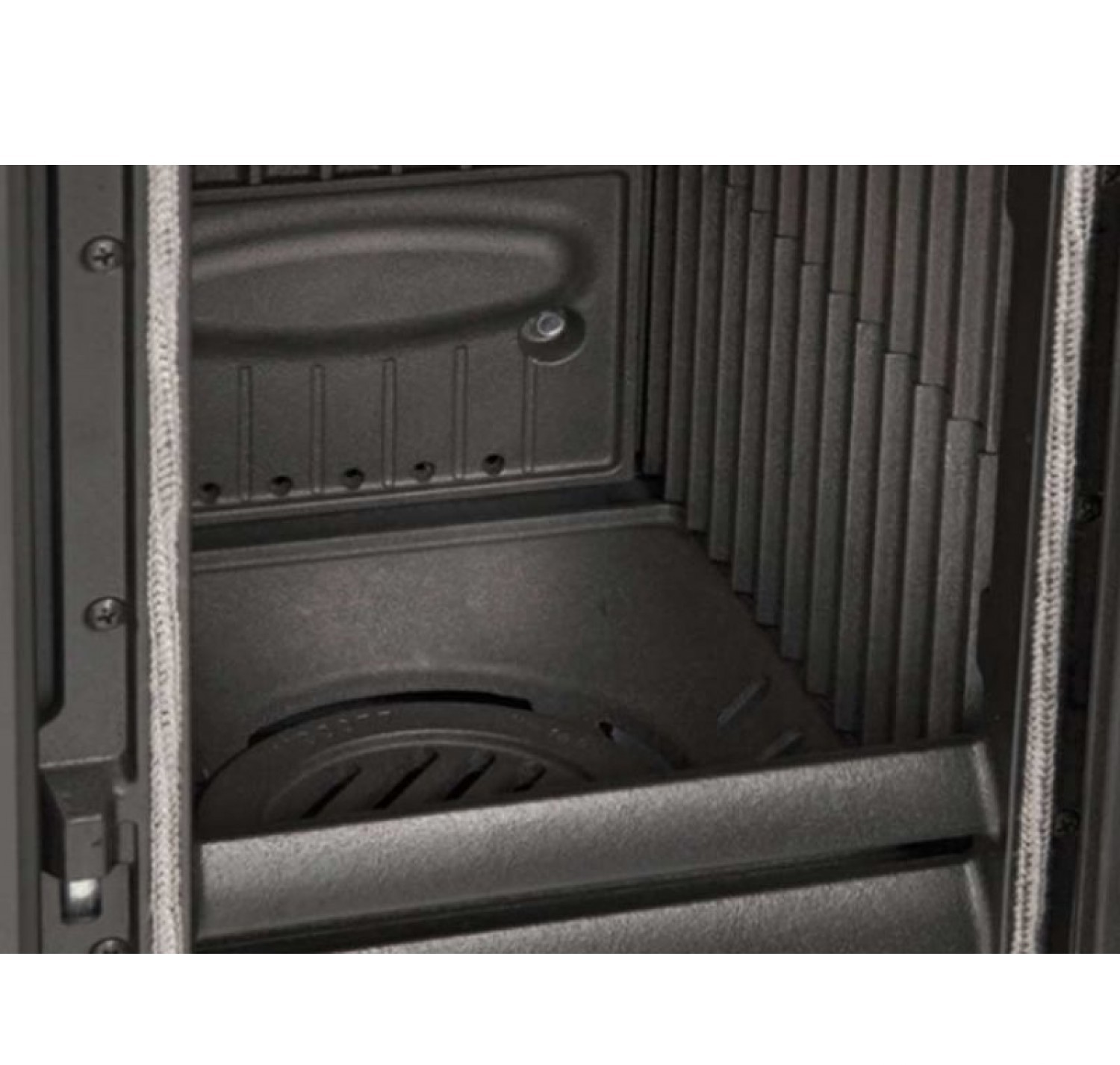 Дверца печи открывается в сторону. Большое керамическое стекло дверцы выдерживает температуру до 750?С. Система «чистое стекло» позволяет беспрепятственно любоваться видом огня. Также печь обладает механизмом бесшумного подъема дверцы.