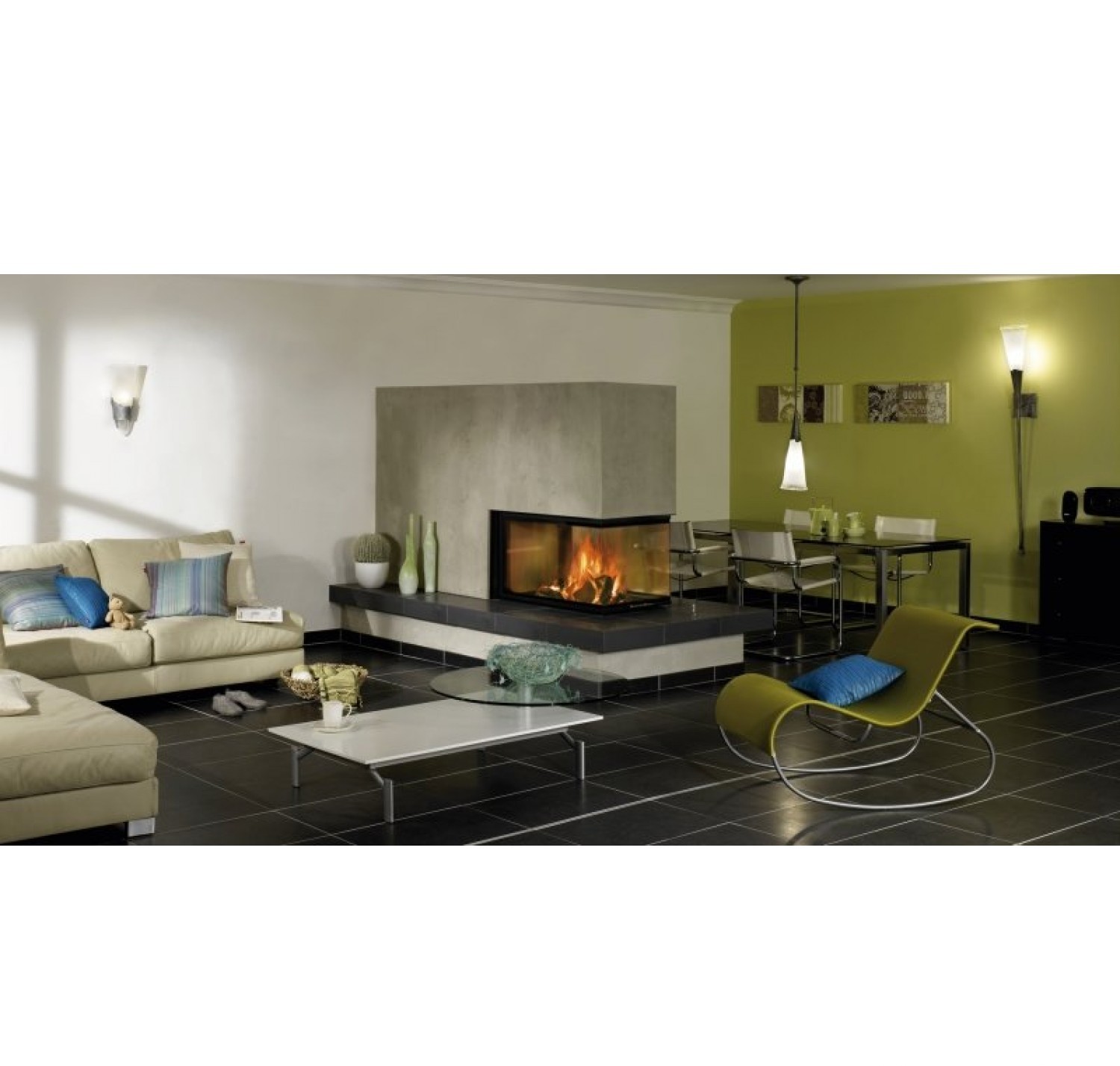 - Стеклянная дверка топки имеет П-образную форму , открывая вид на огонь с трех сторон. Подобная конструкция каминной топки создает ощущение полностью открытого очага, позволяет наслаждаться видом огня из любой точки комнаты.