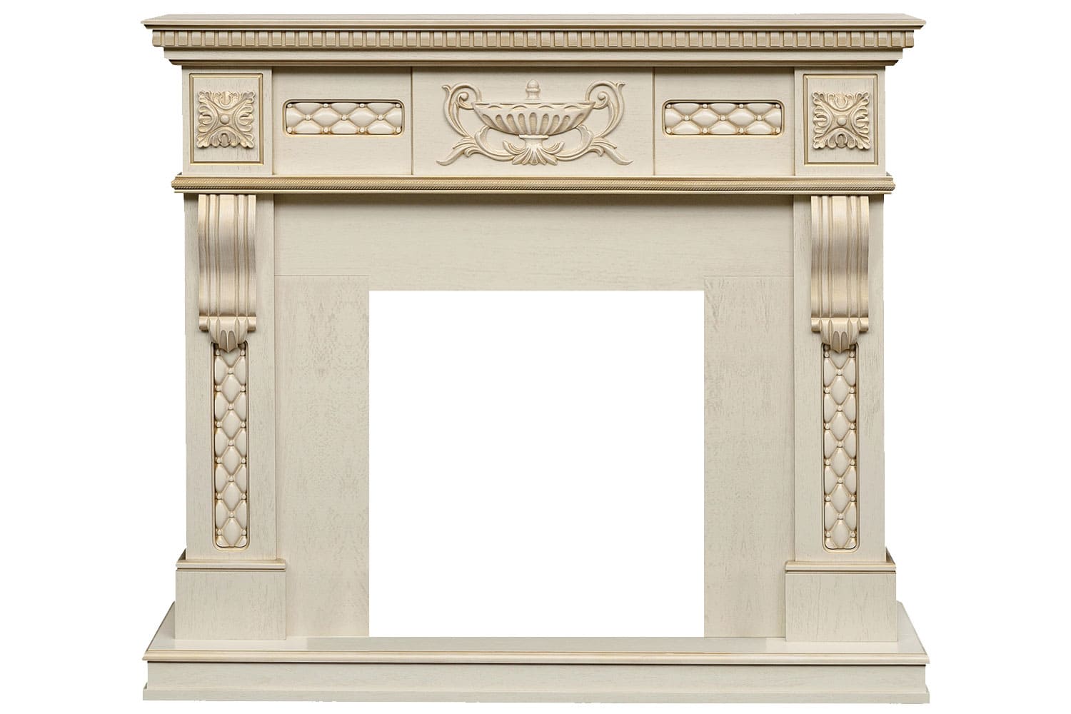 Боковые части портала и фронтон каминокомплекта Dimplex Corsica украшены изящным золотым орнаментом. По центру фронтона расположена лепнина в виде античной амфоры. Кронштейны украшены декоративным узором.