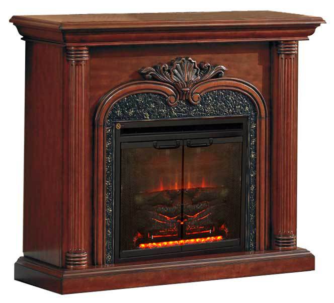 - Изящная резная отделка и панель под металл вокруг очага. Колонны делают обрамление более привлекательным. По центру портала красивый растительный узор.