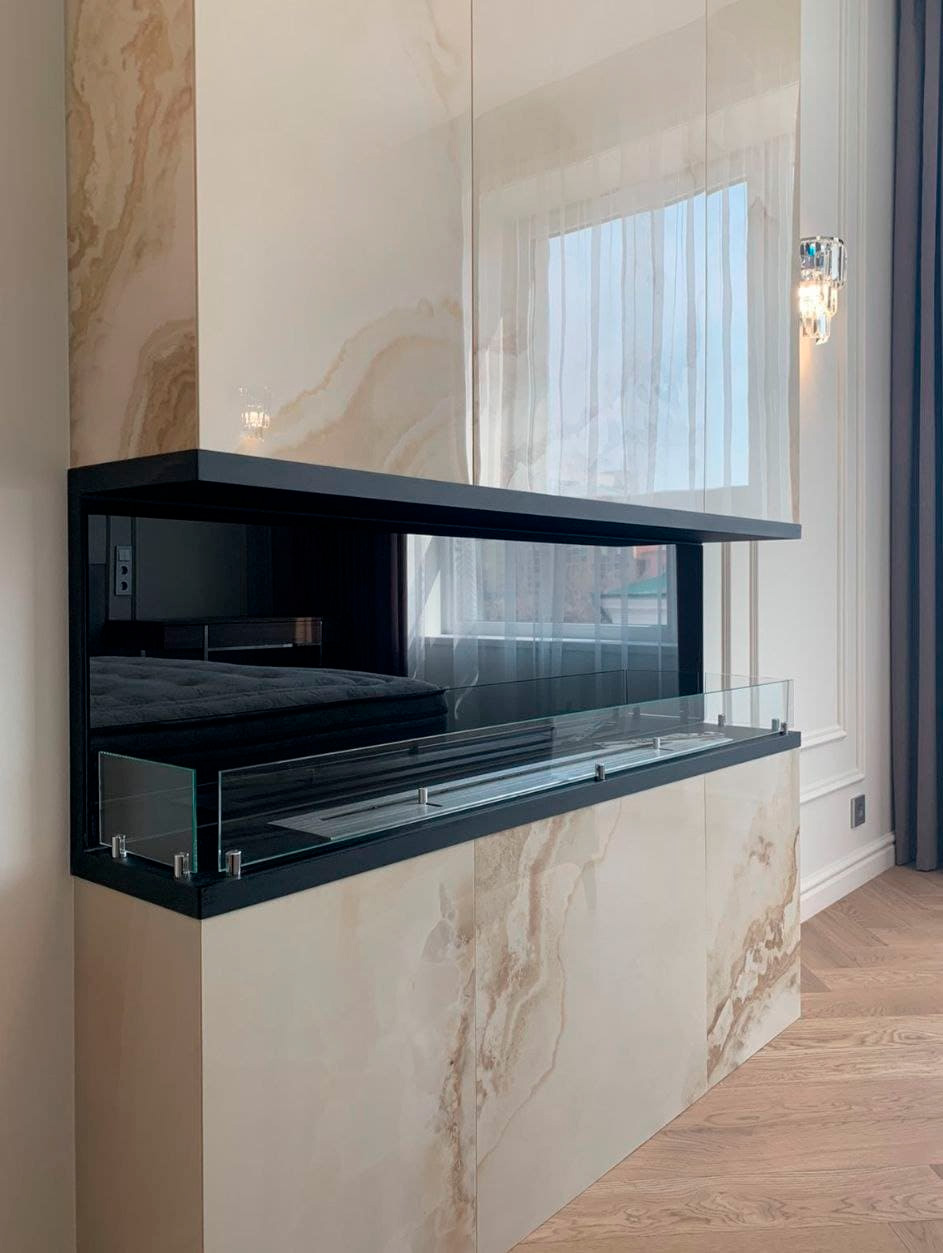 Заказ из города Екатеринбург от Софии. Девушка хотела, чтобы биокамин гармонично подчеркивал спальню и добавлял уют. Наш менеджер подобрал превосходный вариант биокамин Firezo Estremita 1400×450×250, топливный блок 1000мм с линией огня 900мм. Данная модель может быть изготовлена по индивидуальным размерам. Встраивается в стены, проёмы, ниши, каминные порталы.