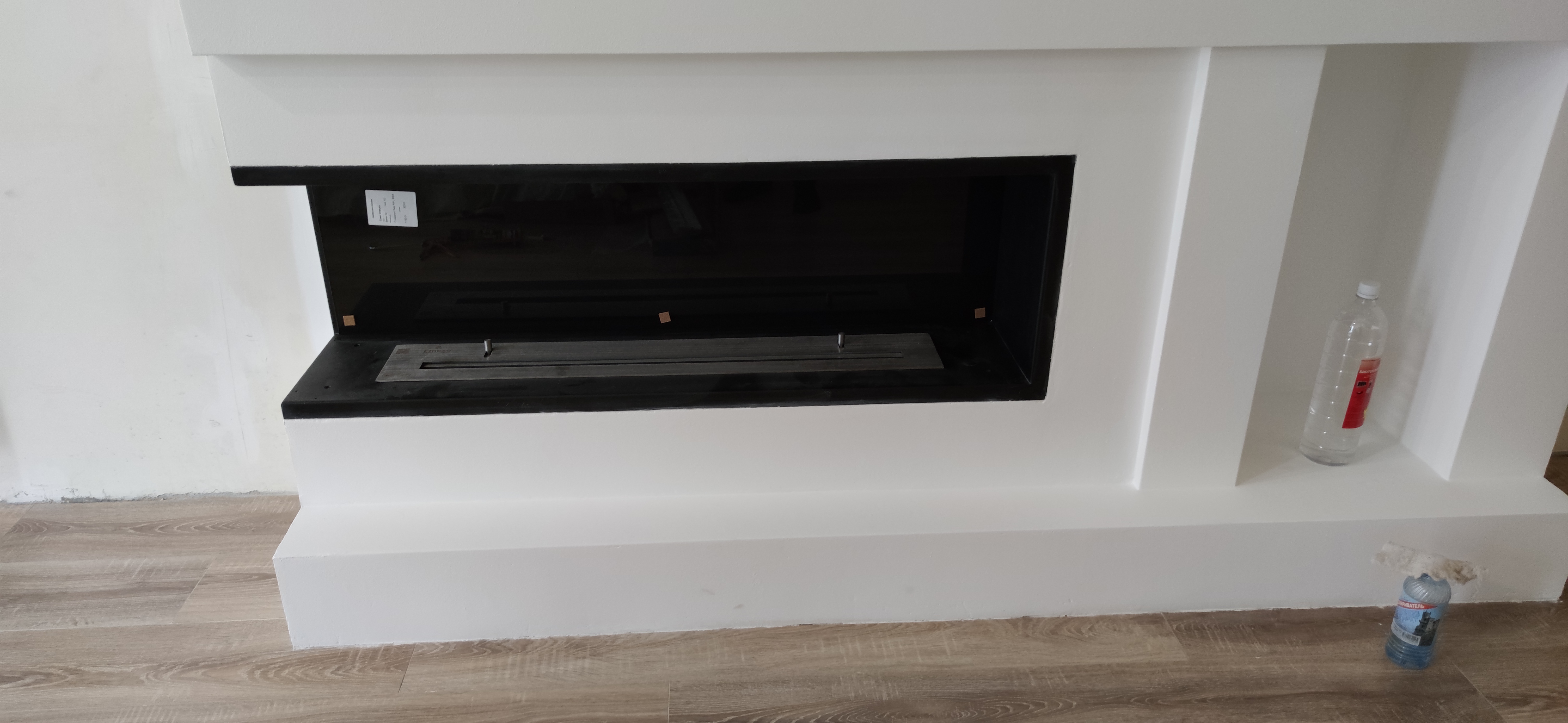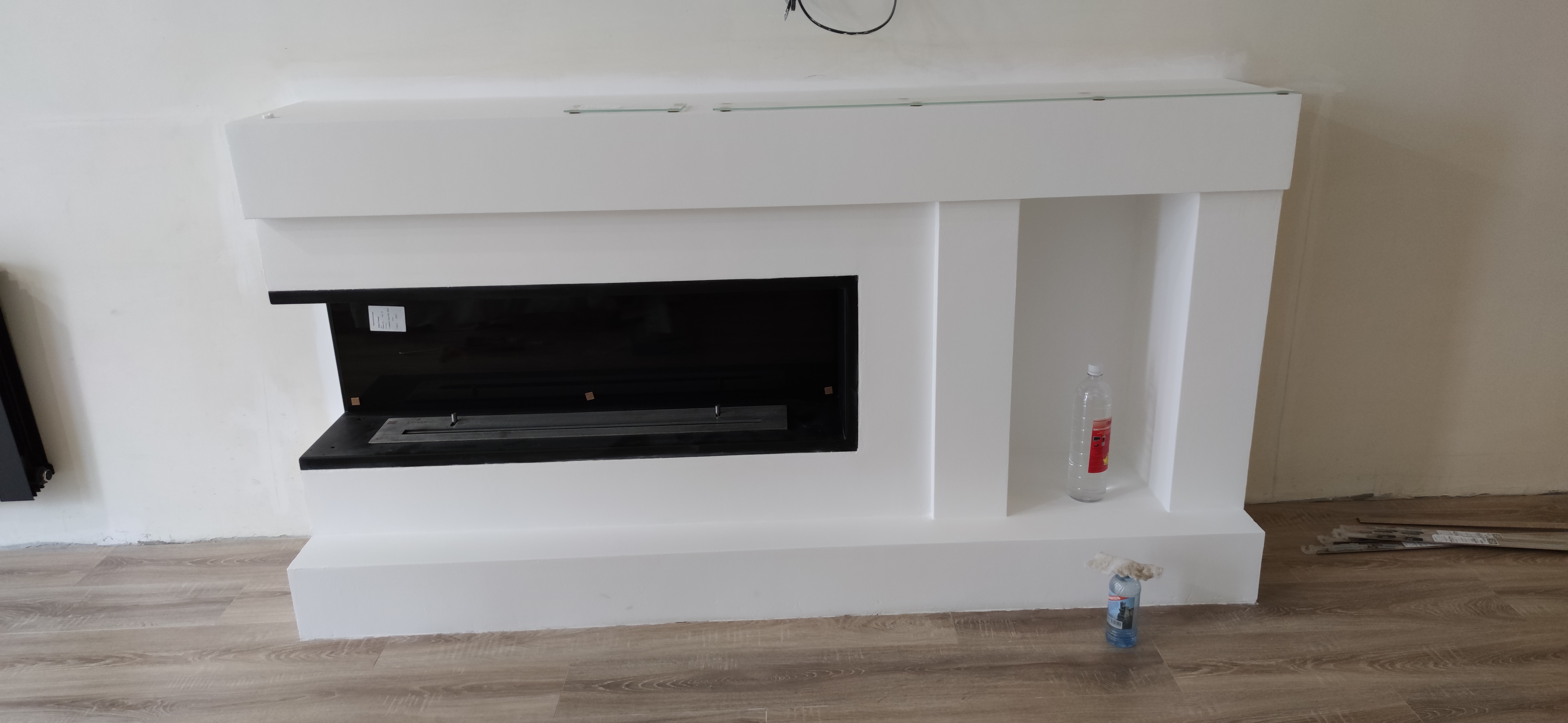Мы сделали и камин и нишу из гипсокартона по проекту заказчика. После установки камина клиент еще заказал дровницу.