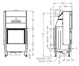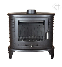 Топка из чугуна, герметичный корпус из стали, корпус распределения горячего воздуха из жароотражающей стали, трубы для разводки горячего воздуха, решетки с жалюзи, бесшумный механизм открытия дверцы, прямое стекло.