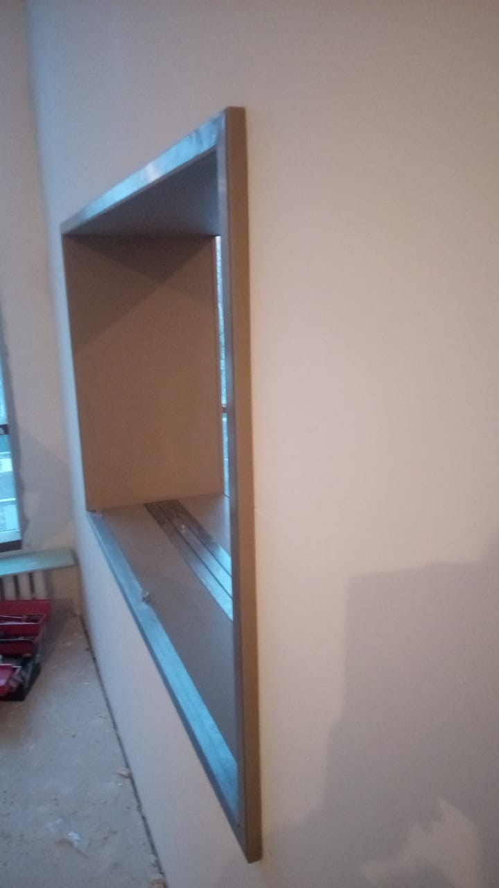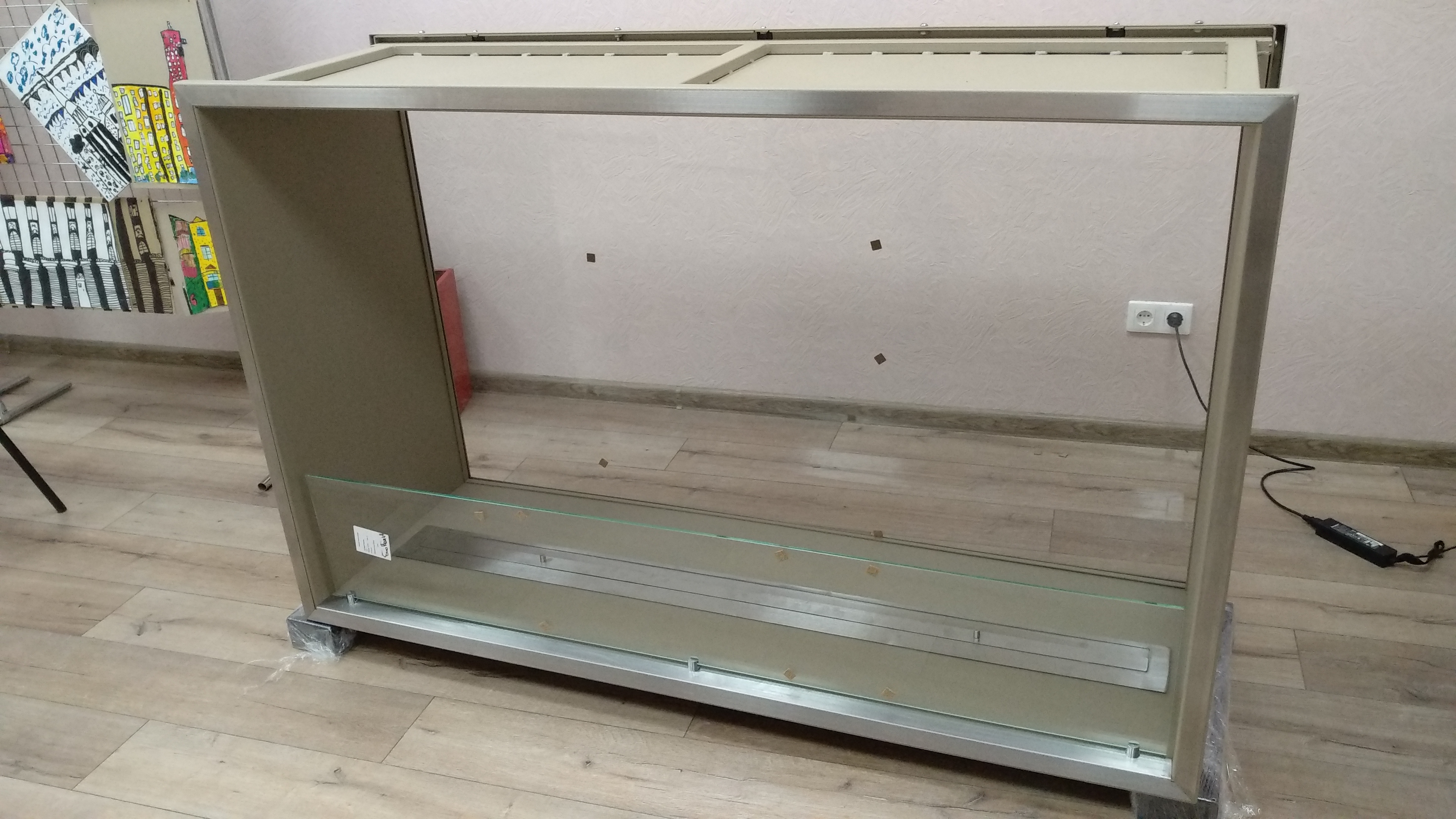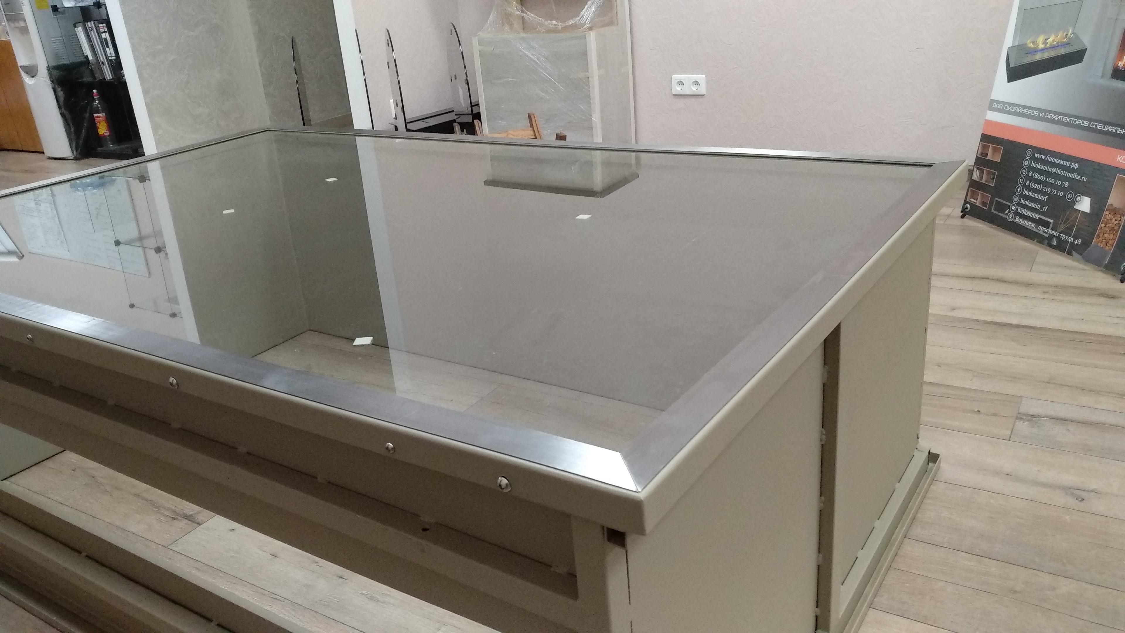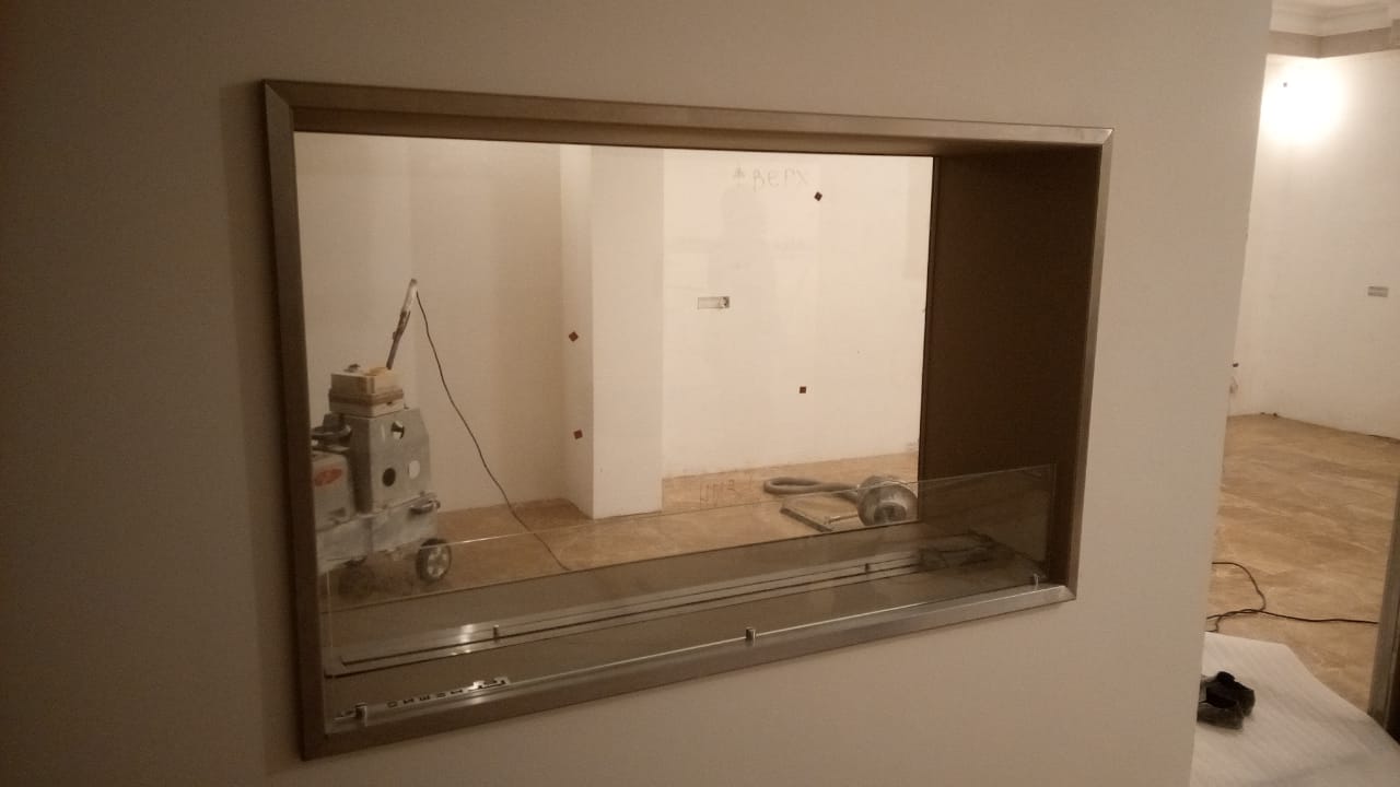 Изготовили сквозной биокамин для гостинной-столовой. Монументальный корпус камина ДхВхГ 1650х1000х500 мм дополняет с одной стороны глухое 8 миллиметровое закаленное стекло с другой стороны защитное стекло высотой 270 мм. Корпус окрашен порошаовой краской цвета бежевый металлик. На внешние рамки с двух сторон приклеены накладки их шлифованной нержавеющей стали. Топливный блок под стать корпусу имеет длину линии огня 1500 мм.